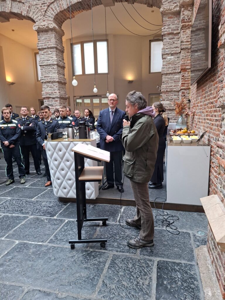 Wereldpremière: Jérôme Duchateau van het Vredescomité Kortrijk speecht in het Kortrijkse stadhuis tijdens de 11 november viering.