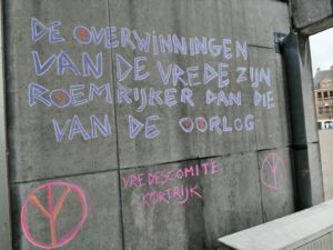 Naar aanleiding van de Internationale Dag Van de Vrede op 21 september voerden wij een krijtactie in de binnenstad. Hierin boden we doordenkers aan rond vrede voor de Kortrijkzanen.