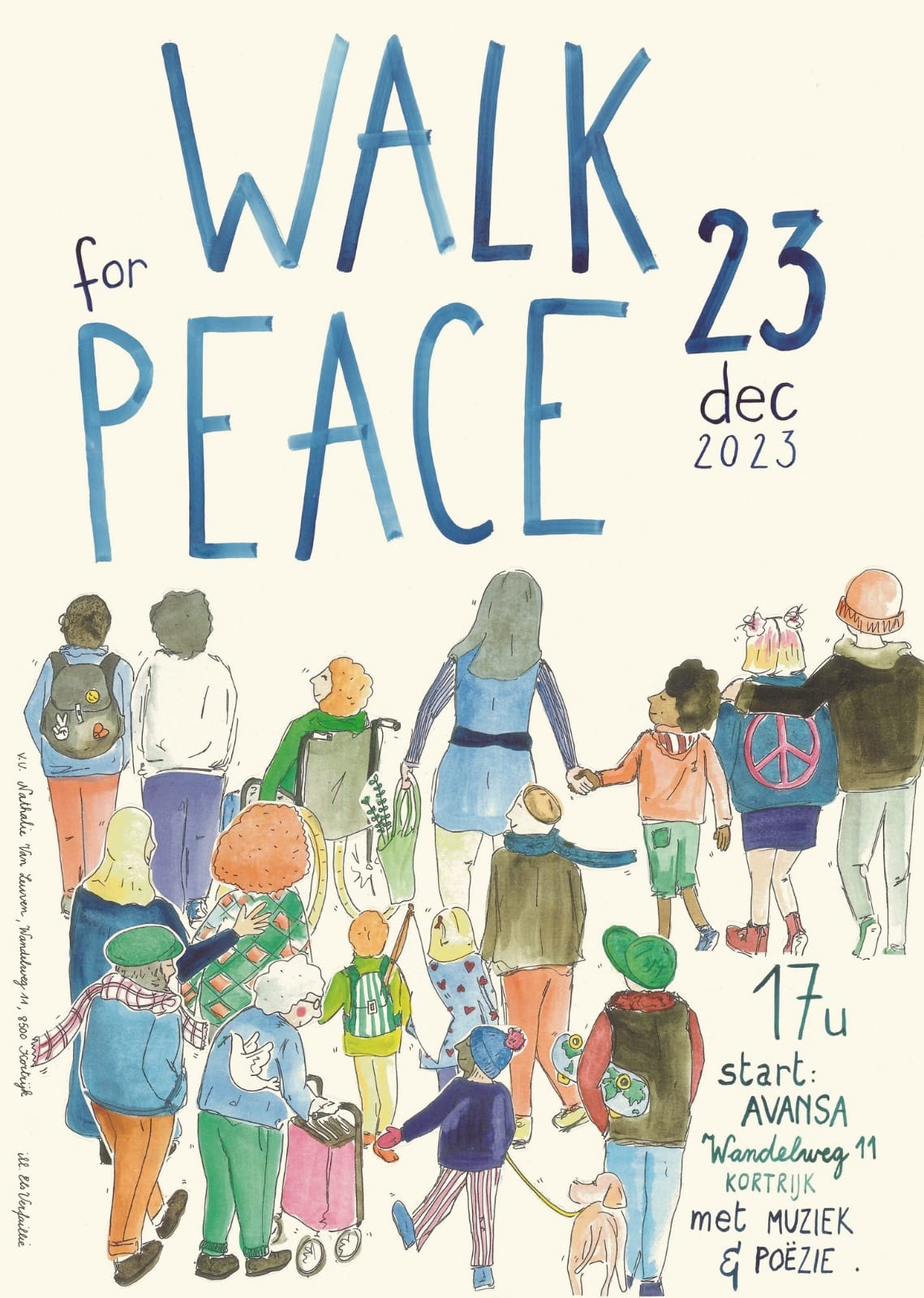 Op 23 december 2023 namen wij deel aan de voorbereiding van en de vredeswandeling door het centrum van Kortrijk.